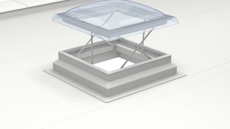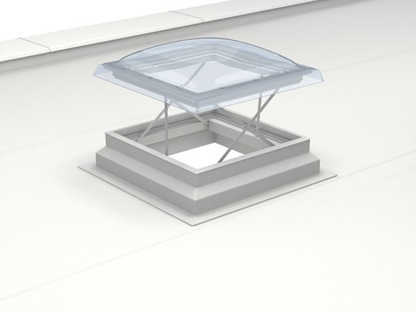 Dobava prozora za odimljavanje za ravni krov s kupolom, dim. 100x100 cm, izrađen od bijelog PVC kućišta visine 31 cm (ispunjen izolacijskom pjenom), s integriranim motorom za otvaranje, ostakljen, dvostruko energetsko sigurnosno staklo i zaštićeno transparentnom akrilnom kupolom. U slučaju požara prozor se automatski otvara i omogućuje izlaz dima i štetnih plinova.