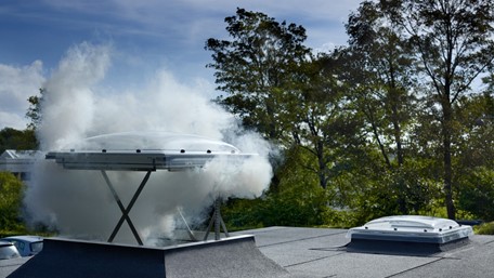 VELUX prozor za odimljavanje na ravnom krovu je idealno rješenje za zgrade gdje je osim udobnosti stanovanja potrebno zadovoljiti i sigurnosne standarde. Najčešće se ugrađuje na stepeništima i aneksima zgrada gdje se u slučaju požara automatski otvara 50 cm kako bi dozvolio izlaz dima i drugih štetnih plinova.
