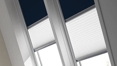 Siesta sjenilo sivo-bijele boje, za zamračenje prostora, zajedno s plisiranim sjenilo za zasjenjenje prostora, s bočnim aluminijskim vodilicama, kao VELUX DFD.