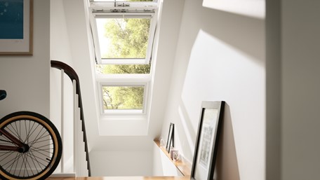 Dobava krovnog prozora dimenzija 55x78 cm, kao VELUX GGU INTEGRA, drvena jezgra obložena zaštitnim slojem od bijelog poliuretana, izvana pokrovni profili od antracit-sivo bojanog aluminija, središnji ovjes, ručka za otvaranje s gornje strane, ventilacijski preklop, dvostruko brtvljenje, dvostruko energetsko sigurnosno staklo.